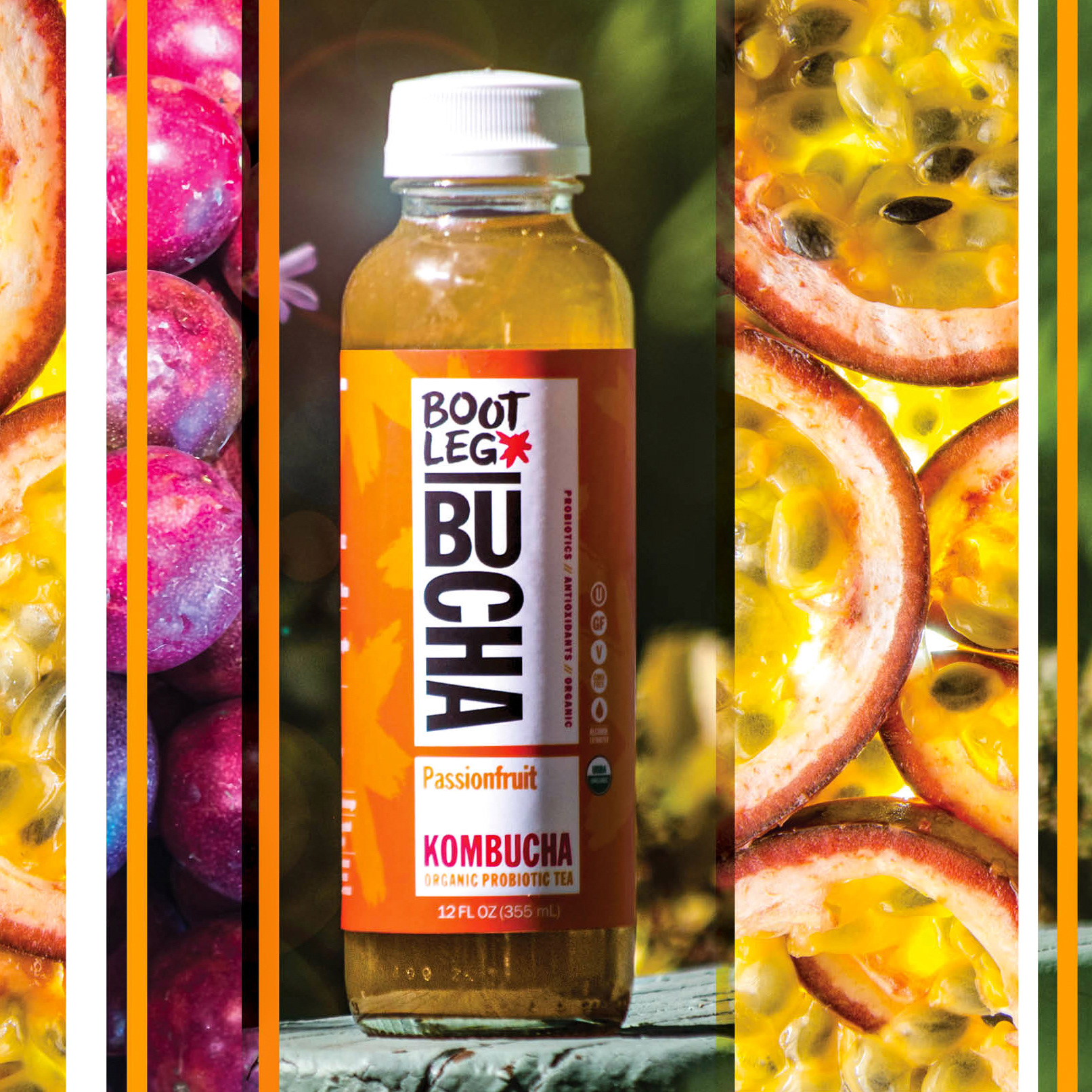 The new bold, typographic logo created for Bootleg Bucha, makes a